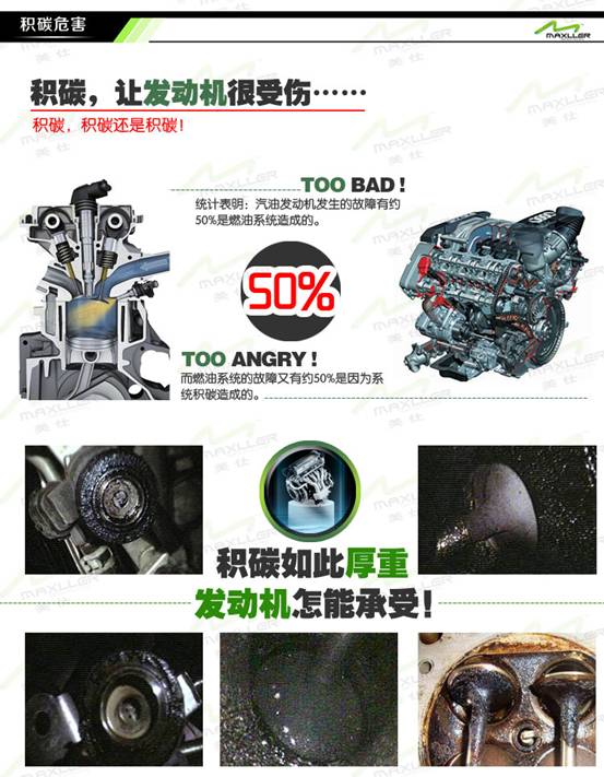 發(fā)動(dòng)機(jī)內(nèi)部積碳增加,會(huì)使噴油嘴噴出的油被吸附,造成發(fā)動(dòng)機(jī)抖動(dòng)、加速不良、燃燒不好、空燃比較差等故障、這些故障會(huì)使發(fā)動(dòng)機(jī)功率損耗增加,從而導(dǎo)致油耗增加、造成不可忽視的經(jīng)濟(jì)損失。