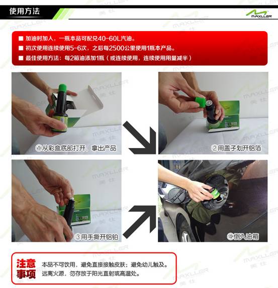 通過對(duì)比實(shí)驗(yàn),效果確實(shí)很明顯。產(chǎn)品使用起來也很方便,只要在加油時(shí)加入,一瓶本品可配兌40-60L汽油。初次使用連續(xù)使用5-6次,之后每2500公里使用1瓶本產(chǎn)品。最佳使用方法:每2箱油添加1瓶(或連續(xù)使用,連續(xù)使用用量減半).
