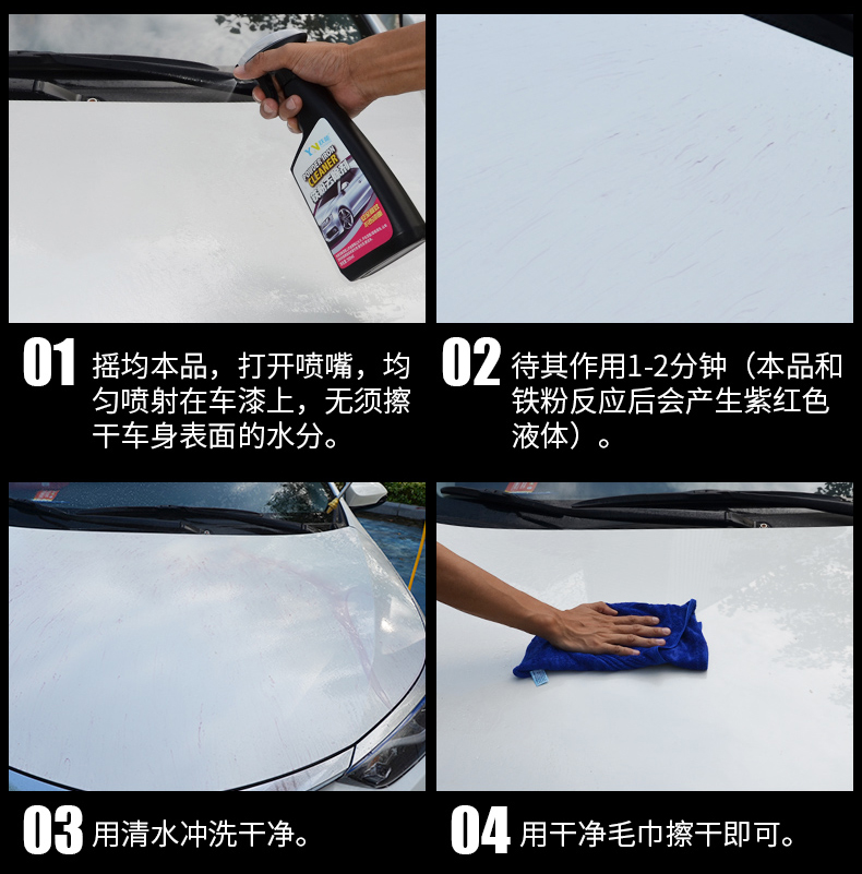 使用前先將車(chē)身清洗干凈;搖勻本品,將噴嘴開(kāi)關(guān)調(diào)整到噴射狀態(tài),打開(kāi)噴嘴;將本品噴射于車(chē)身漆面;再用海棉輕擦漆面使其均勻附著;待其作用1-2分鐘后(本品和鐵粉反應(yīng)后會(huì)產(chǎn)生紫紅色液體)用清水沖洗干凈即可。